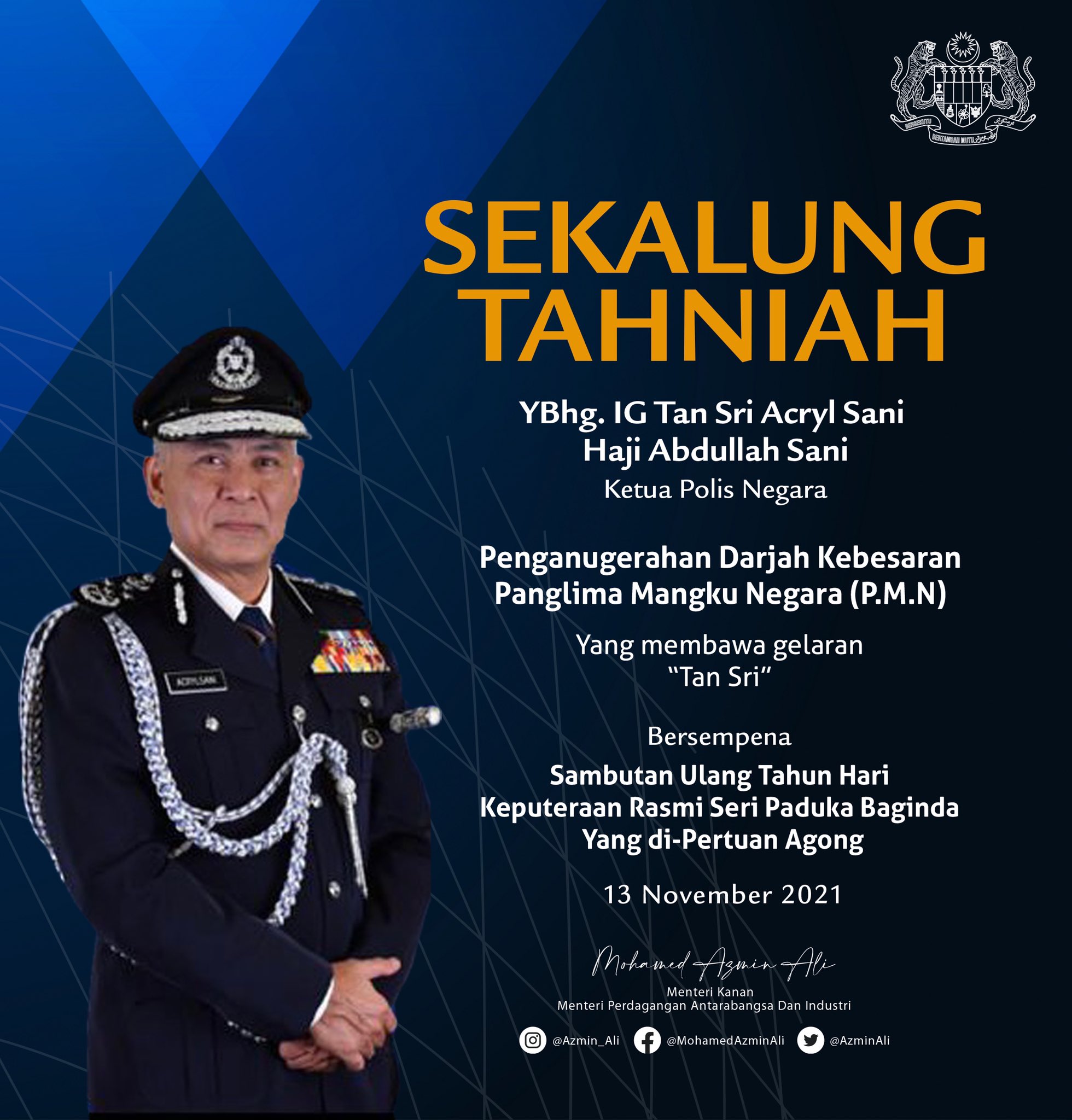 Mohamed Azmin Ali On Twitter Tahniah Diucapkan Kepada Ketua Polis Negara Tan Sri Acryl Sani Abdullah Sani Ke Atas Pengurniaan Darjah Panglima Mangku Negara Pmn Yang Membawa Gelaran Tan Sri Oleh